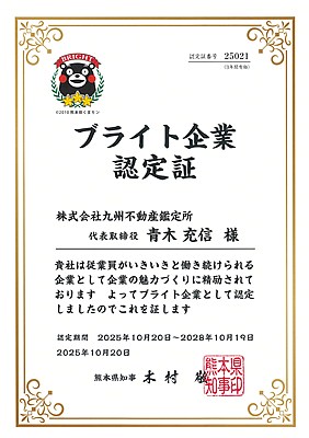 このたび、株式会社九州不動産鑑定所は、令和7年度熊本県「ブライト企業」に認定されました。